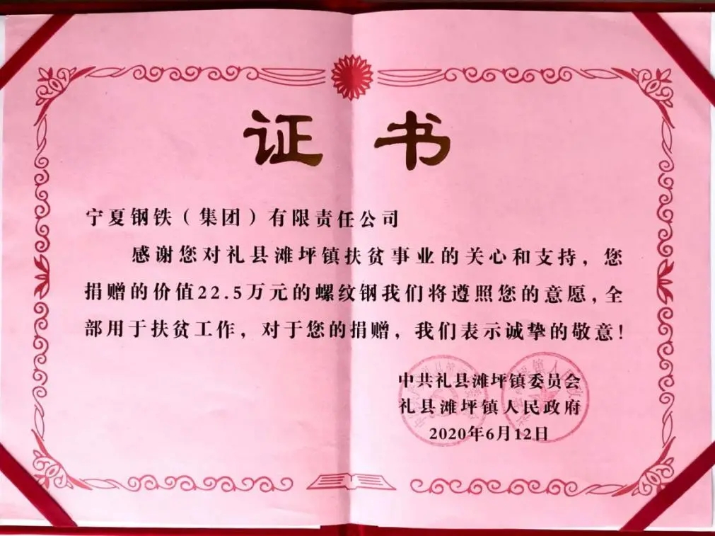 此次捐贈是對甘肅省禮縣灘坪鎮(zhèn)進(jìn)行黨建扶貧工作,公司總經(jīng)理參加并出席了捐贈儀式,以22.5萬元的鋼材助力該鎮(zhèn)黨建設(shè)施建設(shè)。